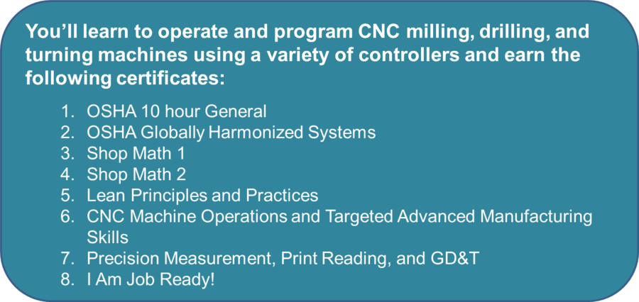 - Shop Math Intensive Intro to Manufacturing and CNC Machining night program lasts 25 weeks and will be offered in March, May and October.